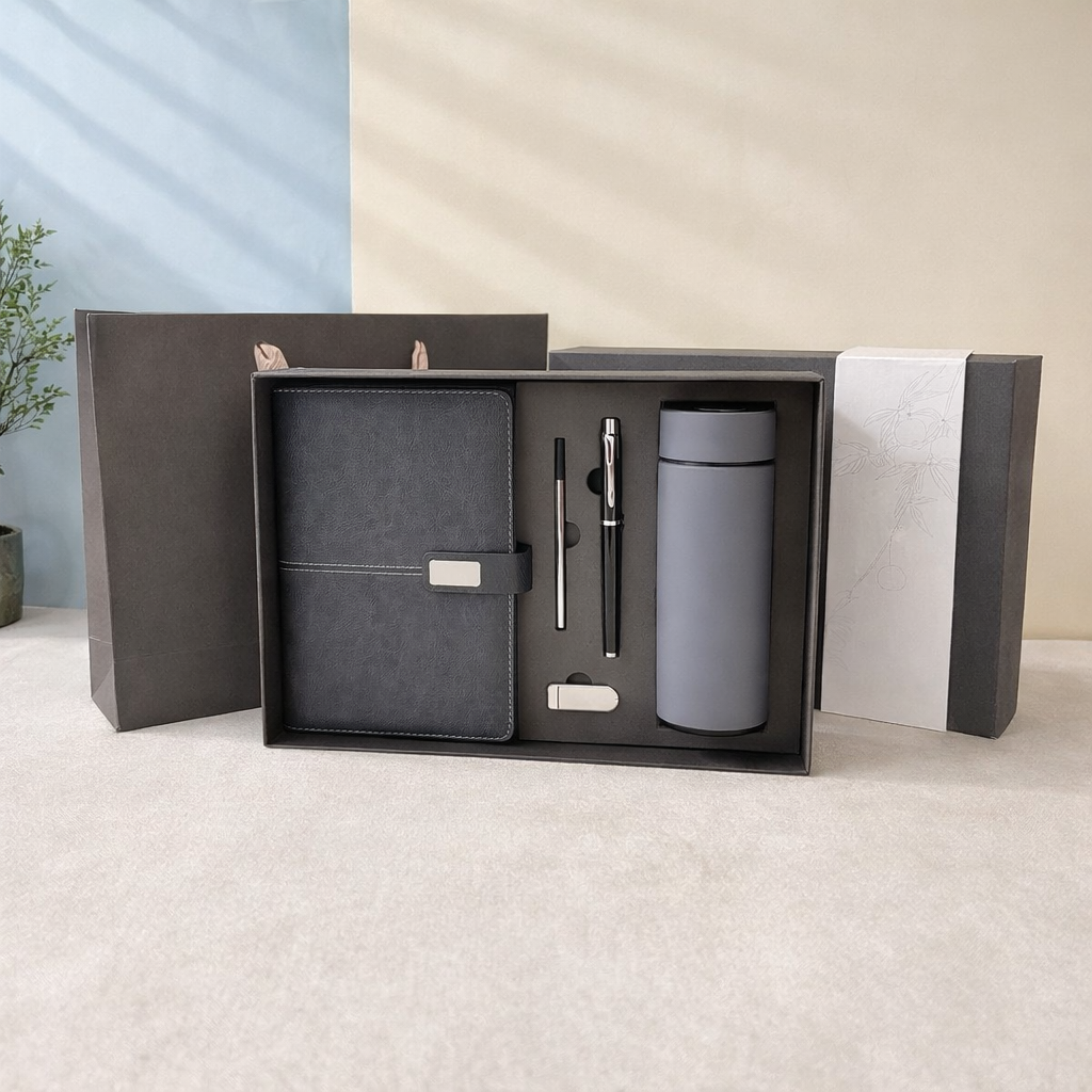 Agenda rafinata, cu coperta texturata si sistem de prindere metalic, ofera o experienta placuta de scriere si devine un accesoriu indispensabil pentru notite, planificari si intalniri. Pixul elegant, cu accente metalice, completeaza perfect estetica setului, iar memoria USB inclusa ofera utilitate suplimentara pentru stocarea documentelor esentiale. Termosul in nuanta moderna de verde adauga un plus de functionalitate, mentinand bauturile calde sau reci pe parcursul intregii zile.