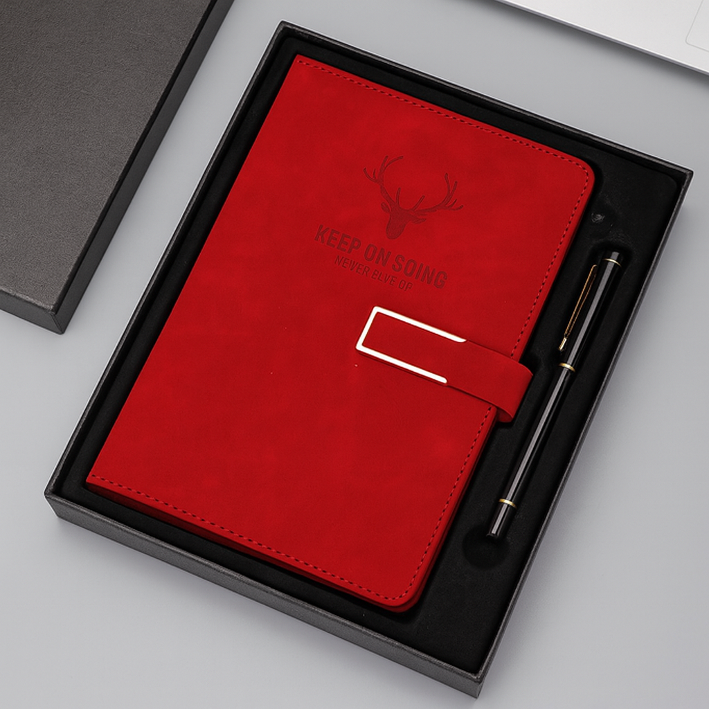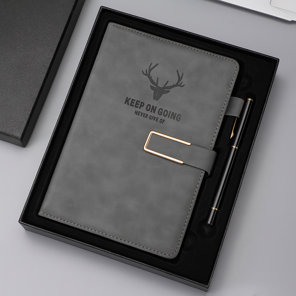 Disponibil in cinci nuante moderne — gri urban, negru clasic, rosu intens, roz pastelat si albastru navy — fiecare varianta este gandita pentru a reflecta personalitatea si stilul celui care il foloseste. Caietele sunt ambalate individual in cutii elegante, alaturi de un pix metalic asortat, devenind astfel cadoul ideal pentru profesionisti, studenti sau pasionati de papetarie de lux.