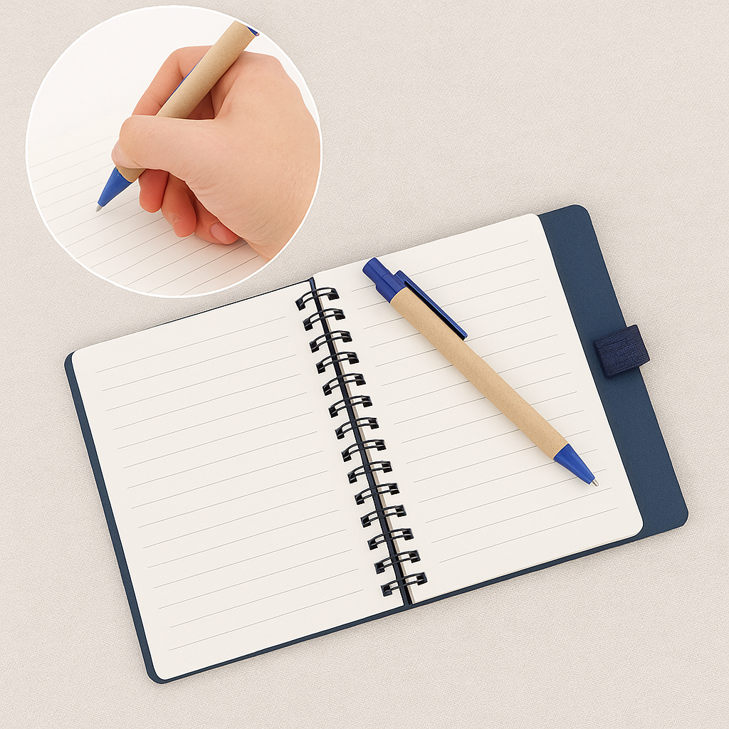Acest caiet spirala combina functionalitatea cu un design modern si eco-friendly. Dispune de o coperta durabila , file liniate pentru o scriere ordonata si un pix din carton reciclat, perfect integrat in suportul lateral. Ideal pentru notite zilnice, scoala, birou sau calatorii.
