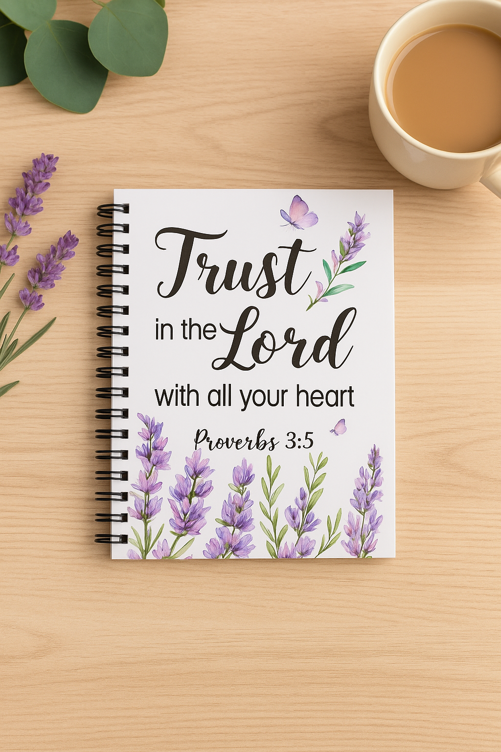 Coperta sa alba, decorata cu flori mov delicate si citatul motivational “Trust in the Lord with all your heart – Proverbs 3:5”, aduce un strop de liniste si frumusete fiecarei zile.