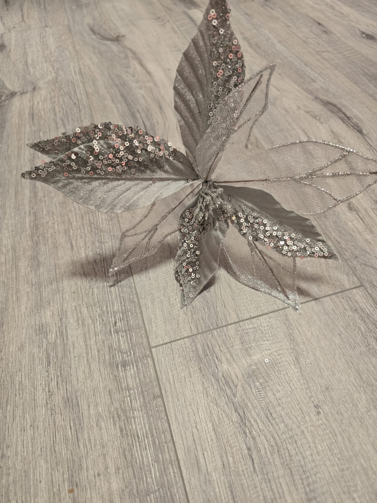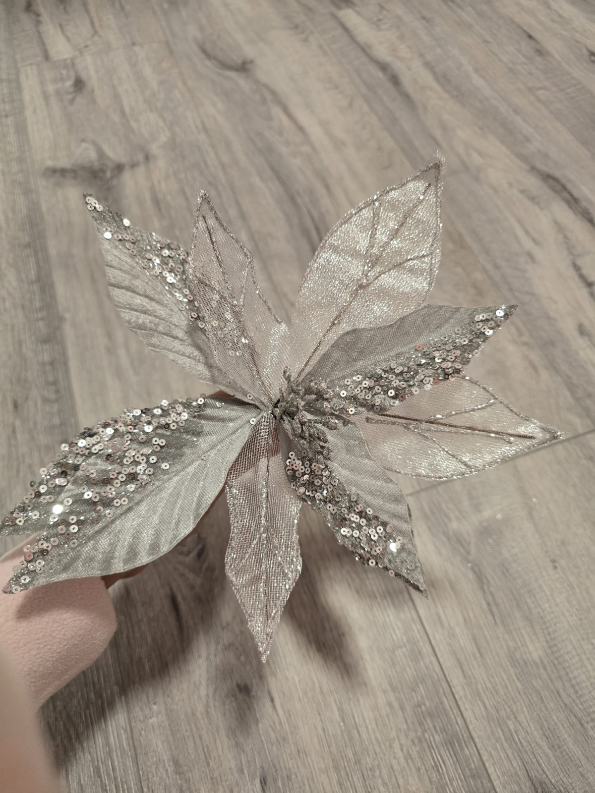Această floare decorativă de Crăciun în nuanță argintiu metalizat este alegerea ideală pentru un decor festiv modern, elegant și plin de strălucire. Realizată dintr-un material textil fin, cu structură ușor rigidizată pentru a-și menține forma, floarea impresionează prin petalele sale ample de 28 cm diametru, decorate cu paiete argintii aplicate manual. Aceste detalii oferă un efect spectaculos de reflexie, care se potrivește perfect cu luminile calde ale bradului.