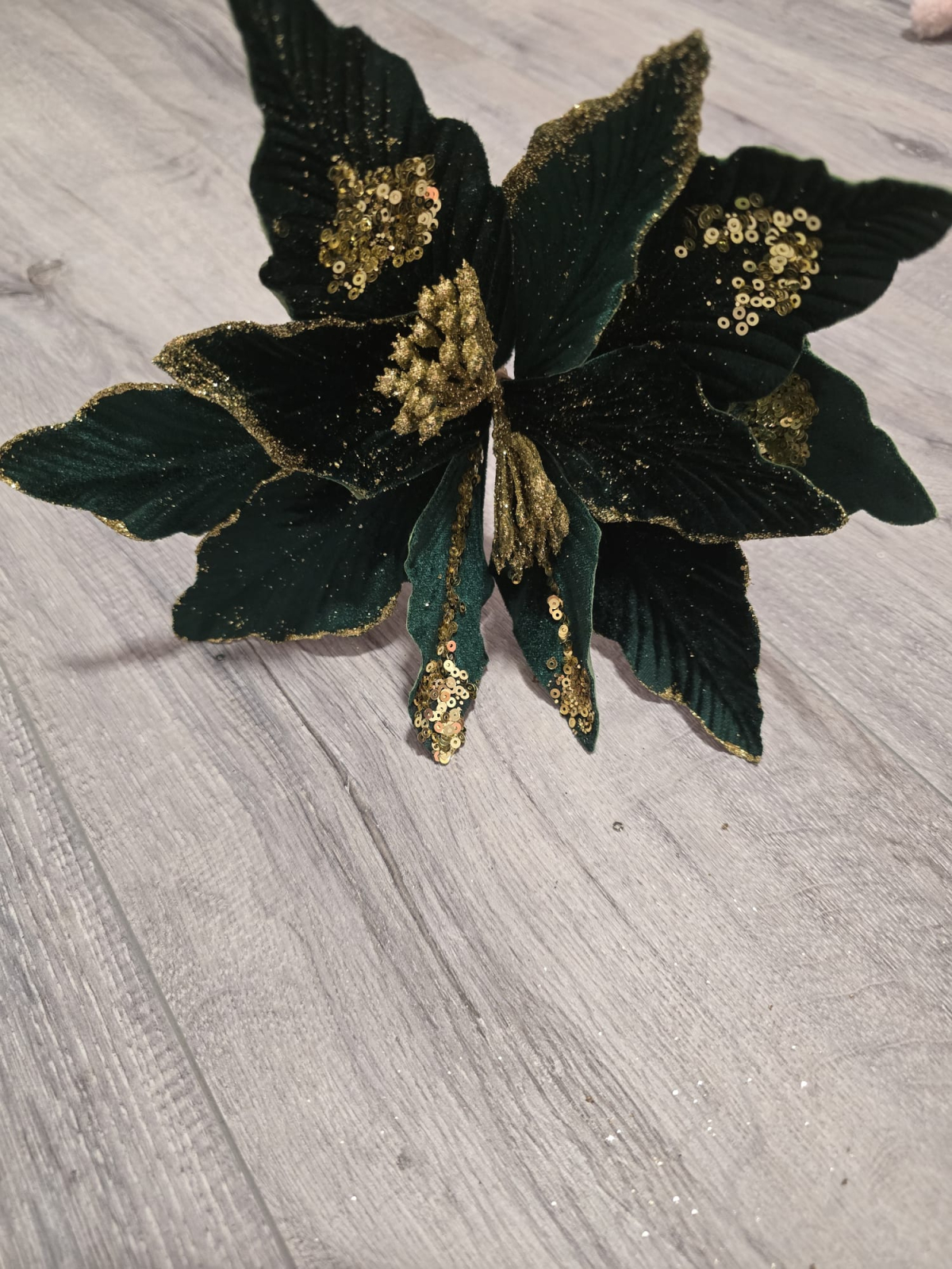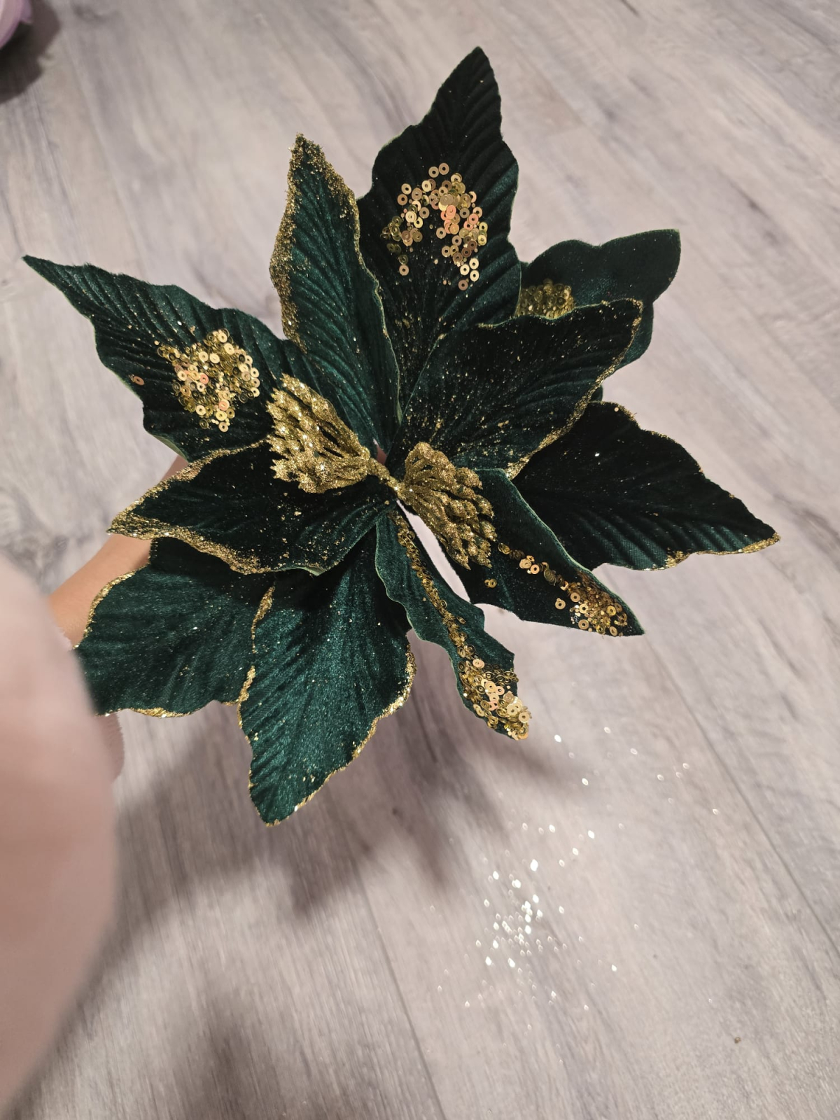 Această floare decorativă de Crăciun, realizată într-o nuanță sofisticată de verde smarald, este accentul ideal pentru un brad elegant și plin de personalitate. Petalele catifelate, realizate din material textil de înaltă calitate, sunt îmbogățite cu glitter și paiete aurii, care creează un efect spectaculos atunci când se reflectă în lumina instalațiilor de sărbători. Designul texturat, conturat delicat cu reflexii aurii, îi oferă o apariție luxoasă, perfectă pentru decorurile festive moderne, glam sau clasice.