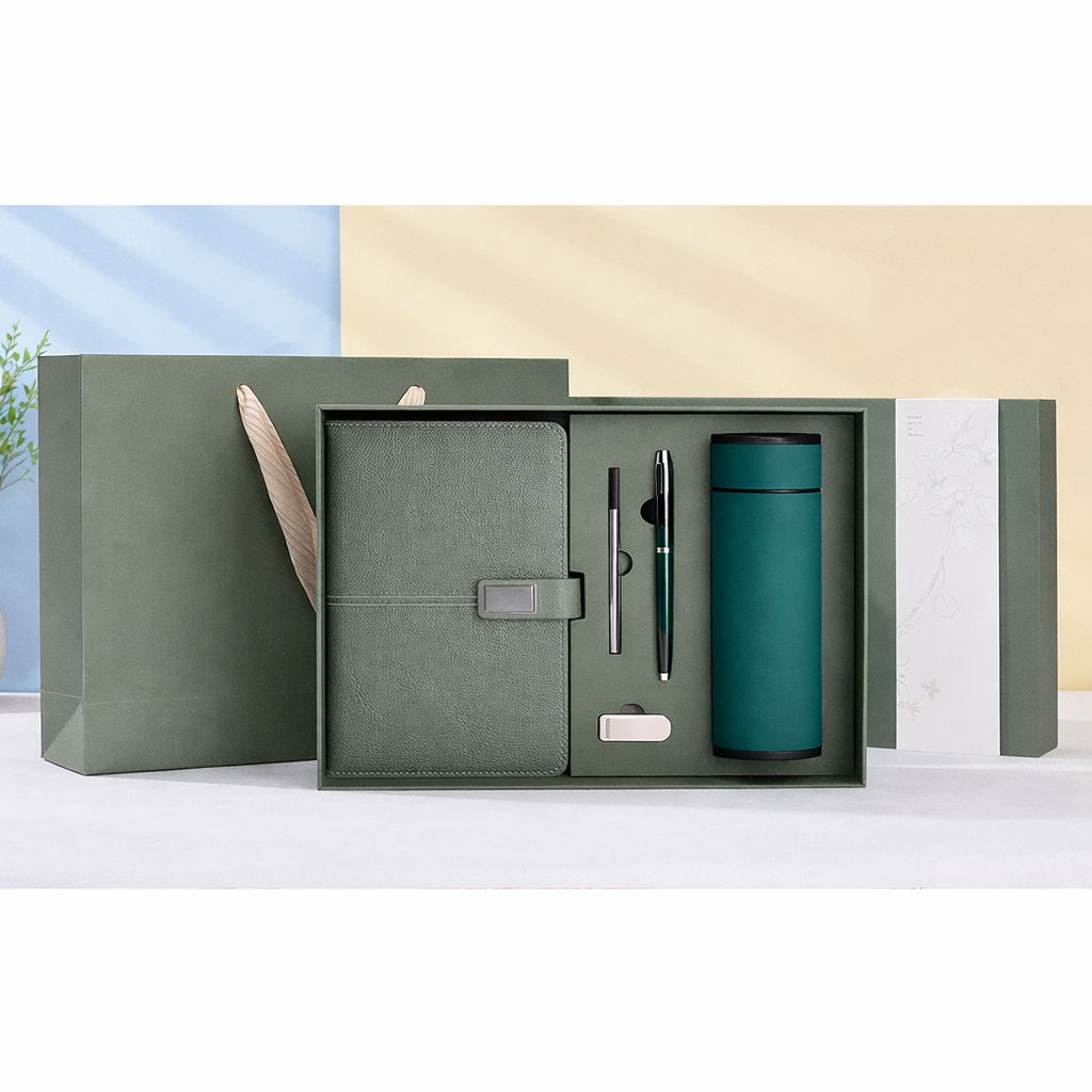 Agenda rafinata, cu coperta texturata si sistem de prindere metalic, ofera o experienta placuta de scriere si devine un accesoriu indispensabil pentru notite, planificari si intalniri. Pixul elegant, cu accente metalice, completeaza perfect estetica setului, iar memoria USB inclusa ofera utilitate suplimentara pentru stocarea documentelor esentiale. Termosul in nuanta moderna de verde adauga un plus de functionalitate, mentinand bauturile calde sau reci pe parcursul intregii zile.